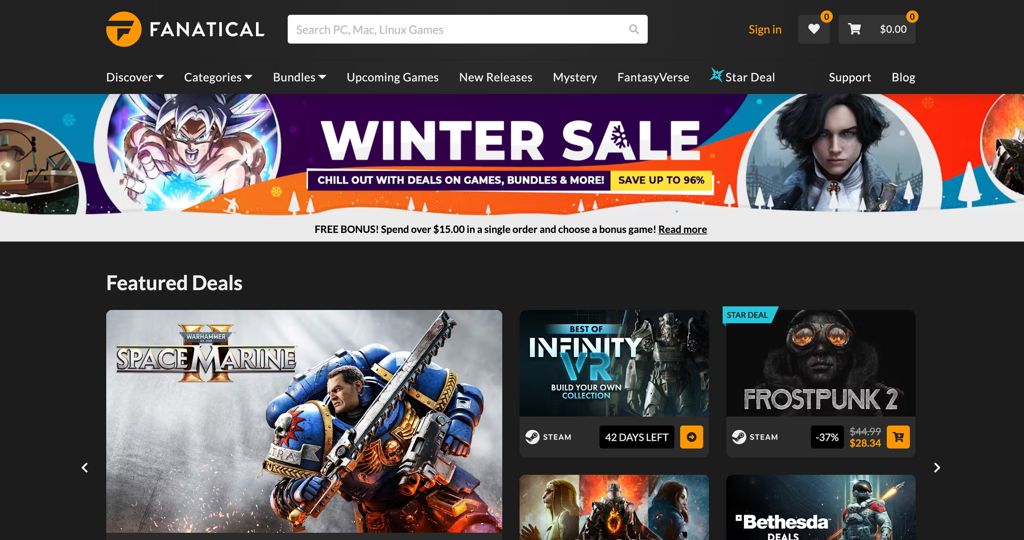 Fanatical’s “Star Deals” and bundles provide exceptional value on PC games, often with savings up to 90%. Their Build Your Own Bundle feature allows you to create custom bundles tailored to your preferences, making it a flexible choice for gamers.